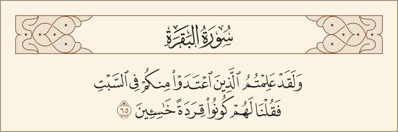 وَلَقَدْ عَلِمْتُمُ ٱلَّذِينَ ٱعْتَدَوْا۟ مِنكُمْ فِى ٱلسَّبْتِ فَقُلْنَا لَهُمْ كُونُوا۟ قِرَدَةً خَٰسِـِٔينَ
